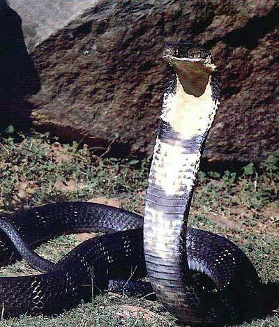 专以吃蛇为生的眼镜王蛇令众多蛇类闻风丧胆,它的地盘休想有他蛇生存。一旦它受到惊吓,便凶性大发,身体前部高高立起,吞吐着又细又长、前端分叉的舌头,头颈随着猎物灵活转动,猎物想逃,可没那么容易!最可怕的是,即使不惹它,它也会主动发起攻击。被它咬中后,大量的毒液使人不到1小时就死亡。
