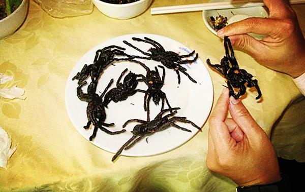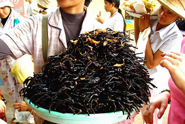 柬埔寨素昆地区出产的一种黑色长毛毒蜘蛛成为了人们餐桌上的美味。当地小贩介绍说,生意好的时候,自己每天能卖出100-200个大蜘蛛。据介绍,这种蜘蛛只要配上大蒜和盐等调料,马上用滚油炸透,立刻就会变得香脆可口,成为一种“无上的美味”,以致于很多外地人在赶到素昆去“大饱口福”后,纷纷带上许多这种“宝贝”回家去慢慢品尝。