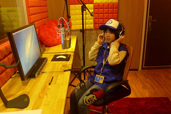 新华小记者赵芮竹、郭静俞等十三人在专业配音老师毛毅茗的带领下参观了企业内的专业录音室,现场录制了配声音频,了解到该企业拥有央视播音员等权威制作师资以及动画游戏配乐团队。