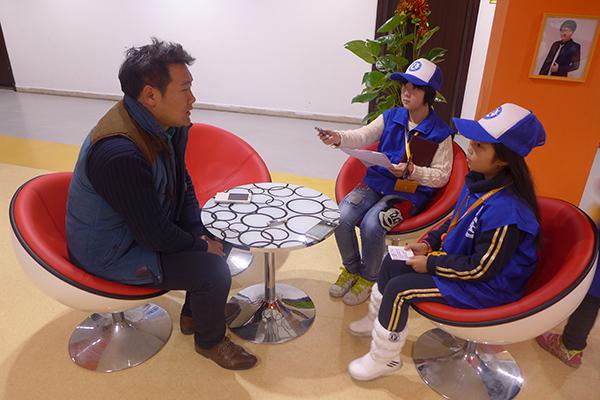 图为新华小记者赵芮竹、王一淋采访金诺佳音国际文化传媒股份公司事业部总监樊亚锋。