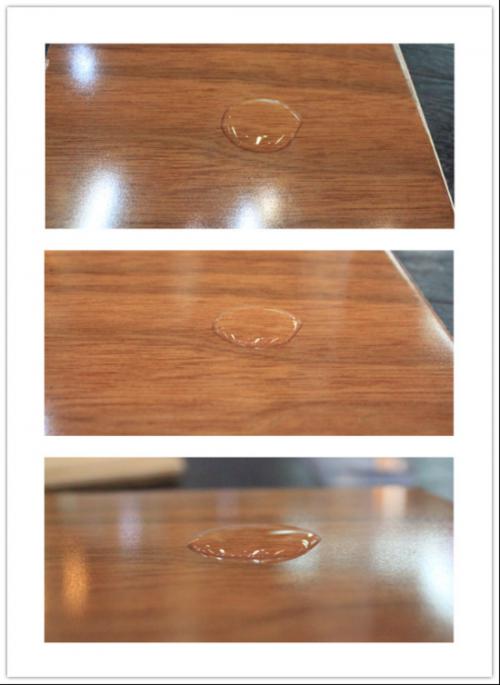 小编将一滴清水滴在地板表面,静置几分钟,观察水珠没有滚动和扩散的现象,也未渗透,擦拭干净后,地板表面也未出现变色情况。可见,此款地板有着很好的防水性能。