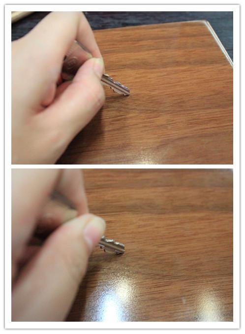 将钥匙最尖锐的顶部对着地板表面,使用较大的力道在地板表面划擦数次,观察地板表面,无明显划痕,表面完好无损,也未产生碎屑。可见,此款地板耐磨度还是非常值得肯定的。