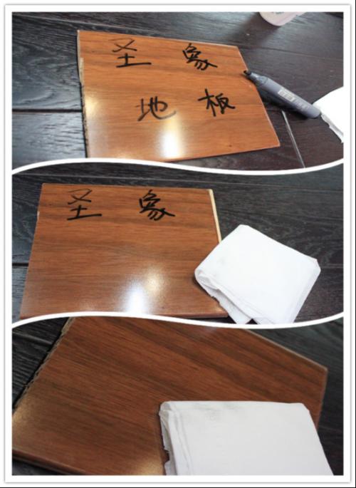 使用较难清除的油性笔在地板表面写上“圣象地板”四个大字,待字迹略干后,使用卫生纸巾擦拭,字迹轻轻松松就被擦拭干净。此款地板抗污力非常的棒,平时对生活污渍的打理就会比较容易了。