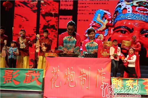 晚会上,对萍乡的非物质文化遗产项目进行了集中展示,优秀的传统文化,精湛的传统工艺,令人大开眼界,赞叹不己!傩面雕刻,古傩萍乡三宝之一,刀法鬼哭之神功,众神面具栩栩如生;花果雕刻,中华独具一枝,赏心品味夺目,果品之精华;面塑雕刻,民俗祭奠一绝,雕出虔诚的敬意、生命的可贵;莲花打锡手工工艺,一担皮箩挑星月,一双脚板走天下;一出传统地方戏“吴燕花”,演绎世上之爱人间之情;上栗爆竹产业绚丽世界,“中国鞭炮烟花之乡”名不虚传;皮影戏声誉赣西,手操帝王将相,口唱才子佳人,鼓乐三尺神明;剪纸手艺,中华民族传统之瑰宝,在赣西萍城也技艺超群;熬着糖汁挑着担,手转百面人,吹开千朵花,吹糖人走街串巷讨生涯;萍乡民间绘画的传承,造就了一代代民间绘画人才,指掌画、农民画就是杰出的代表;芦溪、上栗、湘东,中国现代民间绘画之乡,人才辈出,国家级、省级非物质文化遗产在这块热土上熠熠生辉!