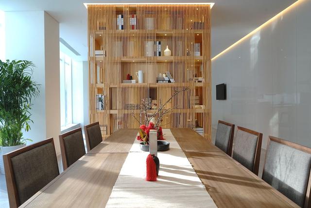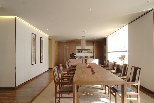 三层主要是私密性极强的私人宴请私厨会及多功能厅。这一区域以胡桃木及米色植物共同构建了儒雅沉稳的书院气质。各种材质的搭配使用暗合传统的五行相生、刚柔并济的理念,这也是吕永中设计作品中常见的中式哲学。