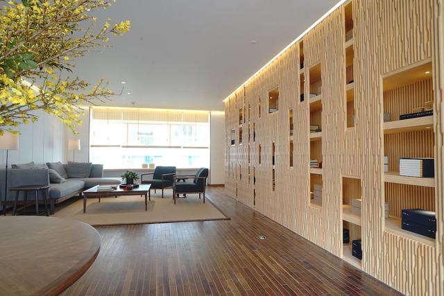 走进室内,再生竹材搭配暖灰石材的使用,为主要的室内展示及活动空间奠定了现代明快的基调,也顺势带出健康环保的理念。