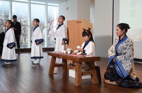 婉转的古琴伴奏下,孩子们朗朗地诵读《大学》