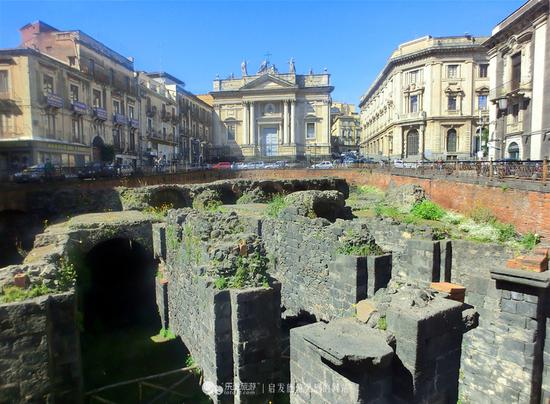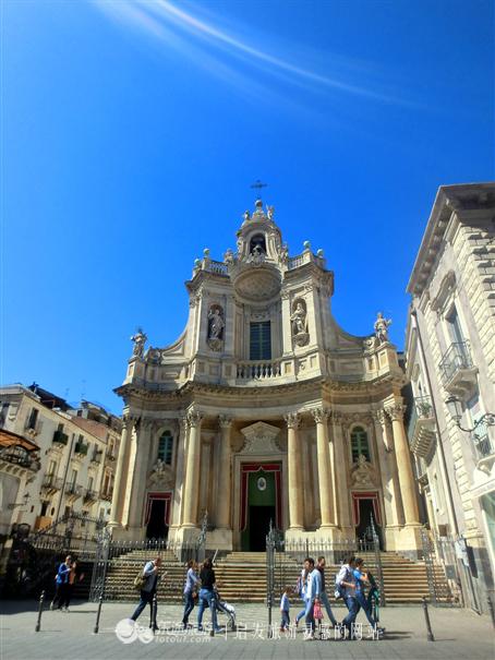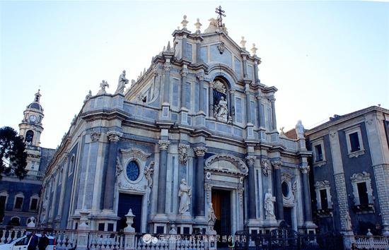 圣阿加塔大教堂(Piazza del Duomo e Cattedrale)是卡塔尼亚的主教堂,世界文化遗产,岛上巴洛克式建筑集大成之处,是意大利第三大教堂。始建于公元11世纪,其后殿仍保留了最初的诺曼式结构,其余部分数次毁于地震。现在的大教堂主要部分复建于18世纪,是由埃特纳火山黑色的火山岩和锡拉库萨特产的白色石灰岩修建而成。整栋建筑既大气又精致,深得我心,每一处都值得细细欣赏、品鉴。