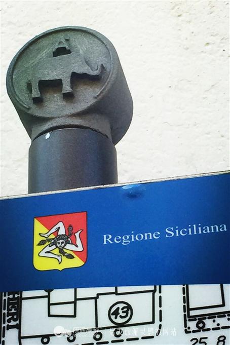 在西西里经常看到这个图案,是岛徽,叫Trinacria。三条腿象征西西里的三个海角,麦穗或水果象征丰饶; 中间是蛇头女妖美杜莎,传说美杜莎的头让珀尔修斯割下来后交给了雅典娜镶在胸甲和盾牌上。所以后来这个美杜莎的头像也象征着岛屿的守护神雅典娜。