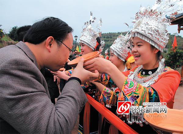 出了麻阳高速出口,驾车不到3公里就来到了橙香园。车子还没驶过第一座木牌楼,大老远的就听到深远的苗鼓声,跳跃的芦笙声,还有悠扬悦耳的歌声。停了车,循声快步来到第二座木牌楼前,嗬,好不热闹!身着盛装的苗家阿妹在牌楼门口一字排开,手举牛角杯,拦门酒拦住了进园的客人,小孩直接领进门,大人就要喝过拦门酒才能被放行。
