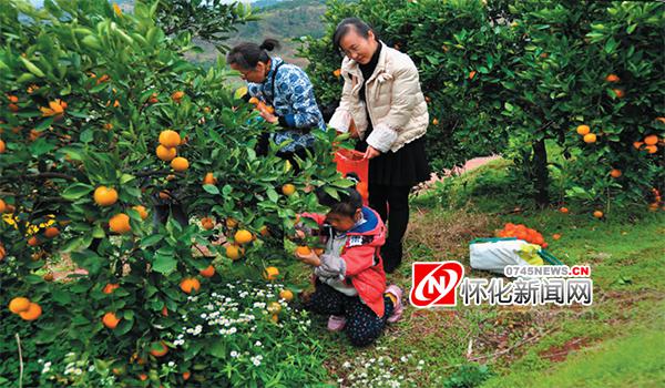 “妈妈,这个大橙子好甜呀,来,我给你喂一个!”可爱的小姑娘周心怡今年才6 岁,她扎着两个麻花辫,穿着大红色的小棉袄,背篓里已经放着四五个自己摘的冰糖橙。她手里正捧着爸爸刚剥好的冰糖橙,欣喜万分地小跑到妈妈身边要她尝尝。妈妈刘欣蹲下来,就着女儿的手,一口就咬掉了半个冰糖橙:“嗯,好甜好新鲜,刚下树的就是不一样。”