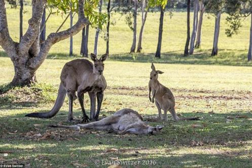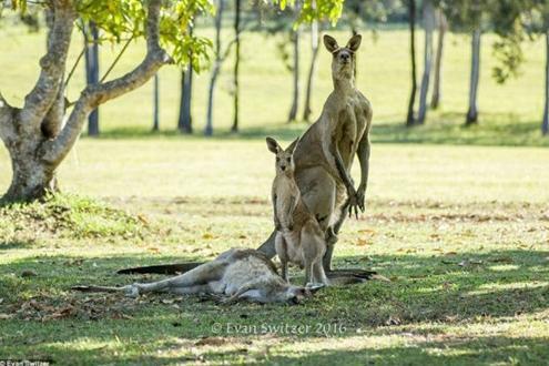 不久后袋鼠妈妈去世了,而袋鼠爸爸还站在她的身旁阻止其他袋鼠接近袋鼠妈妈的身体。Evan Switzer称,他十几年来从未见过这样的场景。
