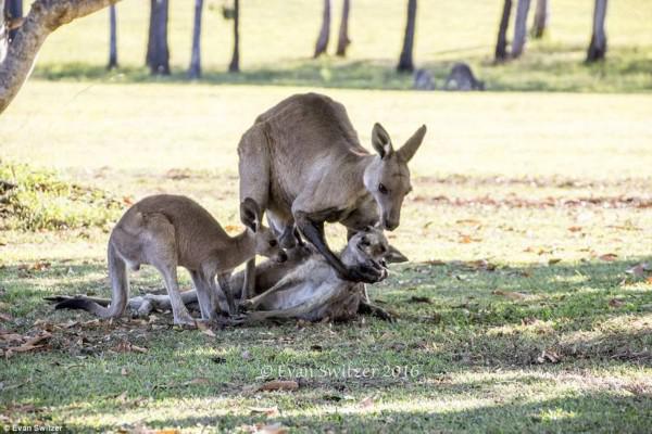 雄性袋鼠阻止其他袋鼠接近雌性袋鼠的身体。