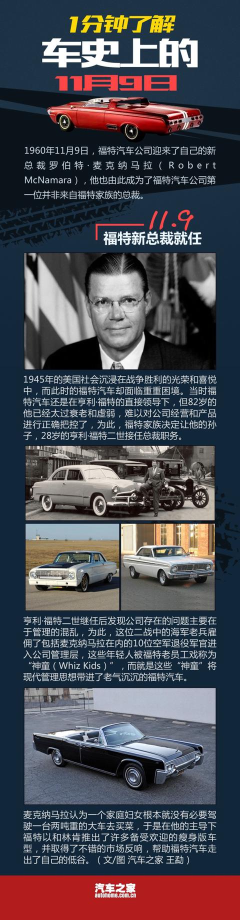 [汽车之家 车史上的今天] 1960年11月9日,福特汽车公司迎来了自己的新总裁罗伯特·麦克纳马拉(Robert McNamara),他因自己为福特汽车做出的卓越贡献而登上这个位置,同时麦克纳马拉也是福特汽车第一位并非出自福特家族的总裁。