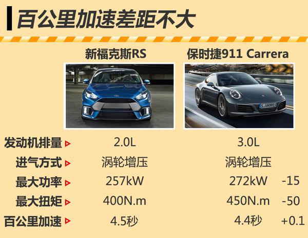 动力方面,新福克斯RS搭载一台2.3L EcoBoost四缸涡轮增压发动机,最大功率257kW,最大扭矩400N.m,并采用了更富驾驶乐趣的6速手动变速箱。值得一提的是,这台发动机与新一代福特Mustang上所搭载的EcoBoost发动机相,可谓“大马拉小车”,新车百公里加速4.5秒完成。目前国内市场中,保时捷新款911 Carrera搭载一台3.0L涡轮增压发动机,最大功率272kW,最大扭矩450N.m,百公里加速4.4秒。在对比新福克斯RS的加速时间后发现,保时捷911 Carrera仅比新福克斯RS快0.1秒。