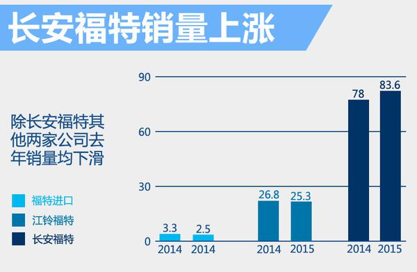 福特十二月份在华销量达到124,768辆,比2014年同期增长27%,创下月销量纪录。从全年整体销量来看,长安福特表现出色。2015年长安福特累计销售新车836,425辆,同比2014年的780,374辆增长了7%。福特进口车和江铃汽车分别销售25,340和253,359辆,相比2014年均出现小幅下滑。江铃汽车十二月份销量较2014年十二月下降12%,仅为 26,391辆。福特官方表示,江铃销量下降与商用车市场目前总体需求疲软的状态有关。