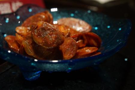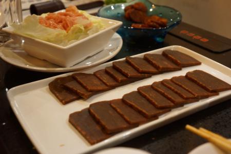 除了美味的鲷鱼火锅,这次的新品还出现了川味香肠、蕨根粑粑,是舌尖带火的一批食材啊。川味香肠是可以直接吃的,入口有点微甜,吃进去后会慢慢有辣味的出现。蕨根粑粑需要入火锅涮食,煮到它漂起来就可以,吃起来糯糯的,但是没年糕那么粘牙,加上它本身没有什么味道,你放在清汤里面它就是清淡的,喜欢辣的小伙伴们也可以放在辣锅里面来吃。除了新品我们还吃了点新辣道的一些招牌配菜:牛肉、虾滑、鸭肠等等。顺便说下,新辣道的蔬菜是自助的,所以喜欢吃蔬菜的小伙伴们可以考虑来个蔬菜自助也不错啊。
