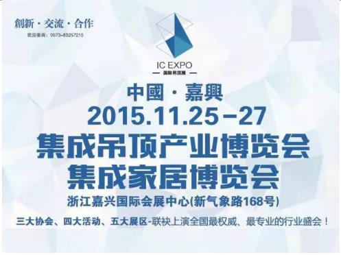 世界吊顶看中国,中国吊顶看嘉兴。2015中国(嘉兴)集成吊顶产业博览会由国家一级协会中国建筑装饰装修材料协会、中国建筑装饰协会、全国工商联家具装饰业商会三大协会联合主办,汇集国内一流集成吊顶品牌,吸引了一大批高端设计师和家装业内企业及经销商,打造了一场全国最专业、最权威的行业盛会。