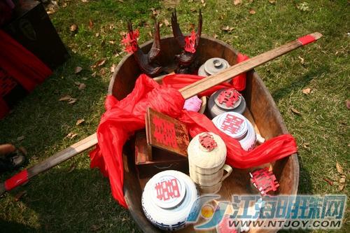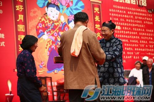 伴随着悠扬悦耳的唢呐声以及铿锵有力的锣声,新娘盖着红盖头,坐在大花轿里,身后还有十多人抬着嫁妆,末端还有小孩儿压车,队伍在媒婆的带领下浩浩荡荡向婚礼现场进发。新娘子接来了,婚礼仪式就要正式开始了。但这时有个上菜的小二端个木头托盘上来打岔,这是为什么呢?原来,小二是问新郎新娘还有他们的父母讨要喜钱,寓意同喜。接下来,身穿喜服的新郎和新娘才在众人的簇拥下正式拜天地送入洞房。据主办方介绍说,南通人的传统婚礼融合了很多汉族传统古礼和婚俗习惯,整个婚礼有看亲、说媒、迎娶、拜堂等近十道程序,非常热闹。
