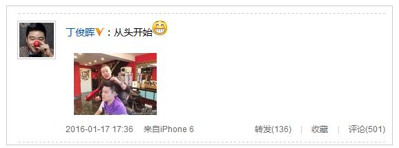 北京时间1月17日下午,丁俊晖更新了微博,微博内容较为简单,只有“从头开始”加一个笑脸。丁俊晖还为这篇微博配了一张图,图片里,发型师正在为丁俊晖弄发型。不知,丁俊晖所写的“从头开始”是否有寓意、希望自己在今后的比赛中获得佳绩?