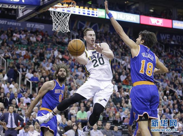 12月9日,爵士队球员海沃德(中)篮下妙传。当日,在2015-2016赛季NBA常规赛中,犹他爵士队主场以106比85战胜纽约尼克斯队。 新华社/美联