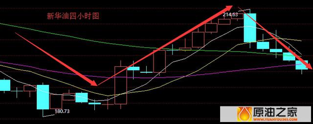 油从四小时走势图来看,布林带张口走平K线价格自上轨快速下破布林带中轨,MACD指标拐头向下粘合且有死叉迹象动能绿柱放量,KDJ指标向下发散,综合来看K线价格受布林带中轨强力压制且下跌势头较强,综合来看K线价格受布林带中轨压制并且下跌势头和下跌动能较强,预计后期价格将继续向下运行。