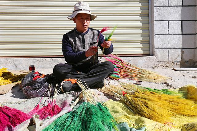 简单地介绍之后,拉姆抱着3岁的儿子小扎西 跟记者告别,记者又往向西南的巷道走了近400米,在一家染了色的冰面门口遇到了正在扎青稞麦穗的阿龙。阿龙很含蓄,话不多,只管麻利地拿起一根根青稞麦 穗用黄色的毛线捆扎起来,然后用不太流利的汉语跟记者讲述着罗萨美朵的制作以及后期“销售”,一边还憨笑着对着镜头说:“不上相,你别拍我!”据介绍,桑 木民俗旅游休闲村,每年制作的罗萨美朵,“远销”林芝、山南、日喀则等地。