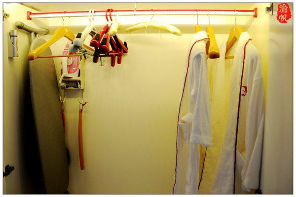 房间的衣柜,有熨斗、熨台、睡袍等。