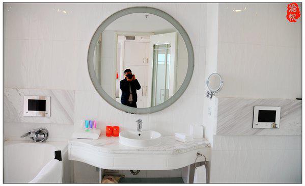 宽大的卫生间,镜头都拍不全,进门正对是洗手台,一边是高档的白色浴缸,一边是马桶。