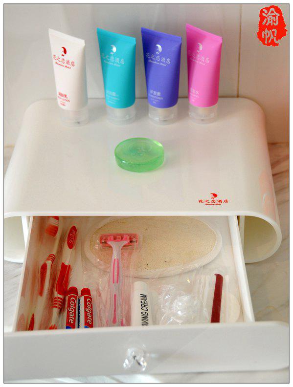 洗手台上放有各种洗浴用品,一应俱全