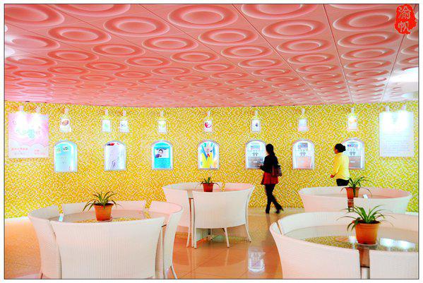 花之恋玫瑰西餐厅位于酒店大堂的右侧,主要由红色、绿色、黄色和白色四种颜色搭配,顶上是波浪形的设计,我们身在其中有一种非常轻松、欢乐的感觉。