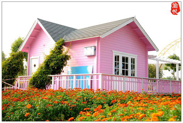 景区还有很多这样色彩鲜艳的小木屋,被四周的鲜花环绕