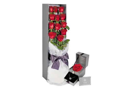 玫瑰礼盒(经典朱砂鲜花玫瑰+白金手链+唯一真爱证明) 3999元