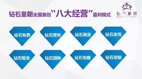 钻石皇朝作为中国钻石消费金融与价值投资引领者,革新传统珠宝市场发展路径,把克拉钻作为主打产品,联合多家上市公司颠覆性地提出钻石免费戴的模式,将钻石与金融、股权投资完美结合,实现了钻石与资本的双重增值!创新的商业模式为珠宝行业的发展带来新的曙光!