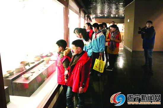 离开市青少年宫,孩子们又来到宋瓷博物馆参观学习。孩子们在导游的解说带领下,参观了以龙泉青瓷荷叶盖罐、龙耳簋式炉、景德镇青白瓷梅瓶、各式造型的三足炉为代表的一批宋瓷精品,认真聆听了1991年遂宁市金鱼村发现大型宋瓷及挖掘经过。