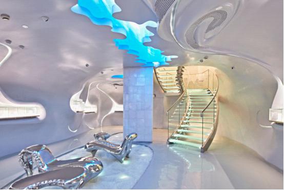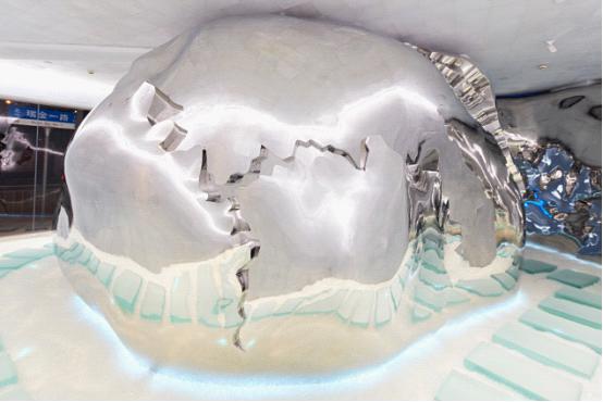 于是,历经5年构思、2年设计、200多次思维碰撞、700余日昼夜不停的建造,“I Do|洹艺术生活空间”以极其惊艳的方式落座于上海淮海中路758号。整栋建筑以“魔幻天堂”为主题概念,以冈仁波齐神山为灵感来源,缔造了一个具有无限想象力与延展力的空间。艺术家在生与死的叩问间不停追寻“爱与永恒”的意义,最终以抽象化的头颅设计为视觉呈现,使两层艺术空间形成了被楼板分割成两部分的巨大液态金属头骨,骨缝开合间流淌着仿佛时光流逝般的蓝光,将人们带入了充斥着不可知之力的魔幻天堂。