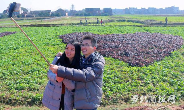 据记者了解,当地农民这一新颖的创意,吸引了无数游人前去游览拍摄。正在油菜地里自拍秀恩爱的小情侣说,他们长期在外打工,只有过春节才能回趟老家,虽然是农村人,但已完全脱离了土地。印象中的耕种都是辛苦枯燥的,没想到原来种地也可以有如此创意,并乐在其中。 一些在外打工回乡的年轻人,还拿出大疆悟无人航拍机记录这充满浪漫情怀的一幕。