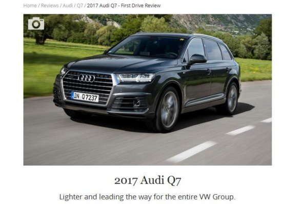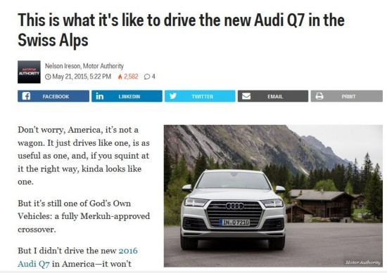 businessinsider网站记者在瑞士阿尔卑斯山脉试驾了最新款的欧版奥迪Q7,他幽默的说:“嘿,美国人,别担心,这不是一台旅行车,只是开起来像而已,而且像旅行车一样实用,碰巧从一些角度看过去,也看起来像一台旅行车。”