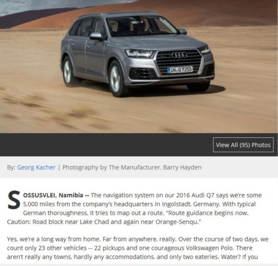 今年4月,著名媒体automobilemag网站记者在远离奥迪德国总部5000英里的非洲西南部国家纳米比亚试驾了2016款奥迪Q7的柴油版和汽油版。