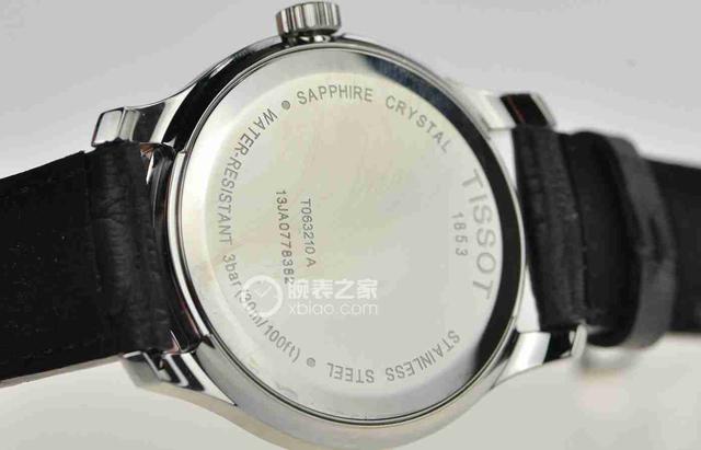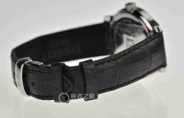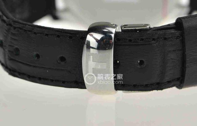 腕表黑色皮带以折叠式表扣链接,不仅开合方便而且不易脱落,安全可靠;表扣上压印天梭标识“T”,经过抛光打磨,圆润有光泽。