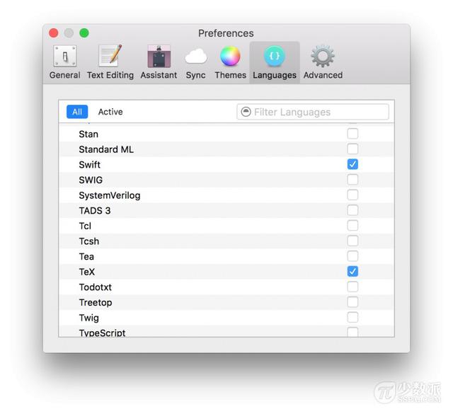 SnippetsLab 对语言的支持做的相当全面,可以选择 100 多种编程语言进行语言高亮标注。你可以自定义现在主要使用的几种语言来进行高亮设置。SnippetsLab 也支持 Markdown 语言,并且开发者表示将在未来的版本中加入 Markdown 预览功能。