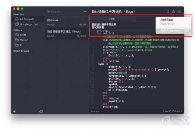 在 Ulysses式架构之外,Snippetslab 还加入了一个新的管理层级 —— 「Fragment」,即是在一个文档里再加入低一层级的标签分页,让 Snippetslab 的代码碎片的收纳性更进一步。同时 Snippetslab 考虑到了代码备注的需求,支持在代码文件中添加 Notes 并以置顶形式备注悬浮在编辑窗口上方。