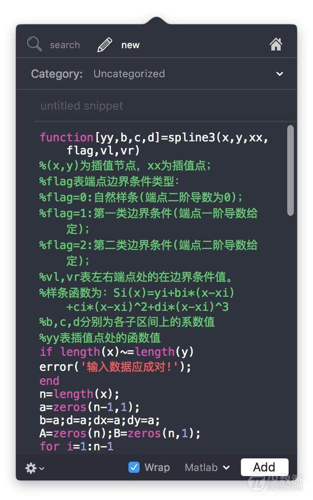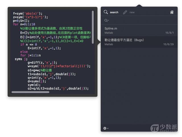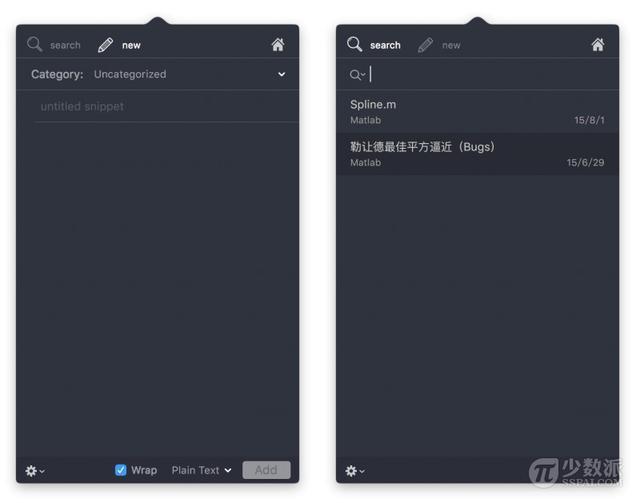 在这种情景下,你可以非常碎片化的编写程序,并且可以快速的将代码调用到各个其他的程序上。而Snippetslab做的就是将这些代码收集在一起,让你可以快速搜索并调用,将一个个小的程序片段快速的组合。