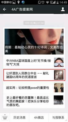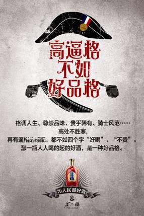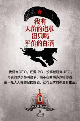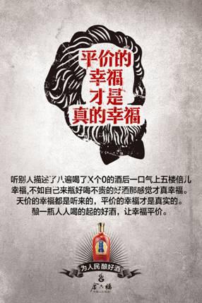 据了解,金六福《民酒宣言》共有6张海报组成,以“为人民酿好酒”为题,海报文案处处彰显关于“民酒”的呐喊,如“好酒喝得起才是硬道理”、“我有天价的追求但只喝平价的白酒”、“平价的幸福才是真正的幸福”等,同时又不忘为共和国65周年献礼祝贺,并在10月1日国庆当天官方微信发布,精彩的创意表现,在发布后即吸引了“4A广告提案网”、“广告主杂志”、“酒业家”等营销界及白酒行业权威媒体的推荐,成功在国庆期间吸引了舆论关注,引发广泛好评。