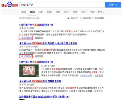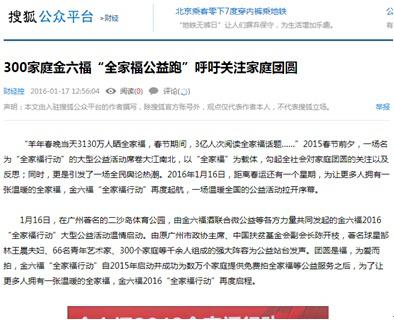 1月16日,金六福酒2016“全家福行动”大型公益活动在广州温情启动。活动现场,万张全家福拼接而成的“史上最大全家福拼图”震撼亮相,郜林携妻子王晨与300幸福家庭、1000余人参加“全家福公益跑“引发热议。除了活动现场的温暖、激情与震撼,活动之后的媒体报道同样振奋人心。