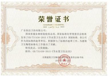 恒洁参与GB/T31436-2015《节水型卫生洁具》国家标准起草荣誉证书