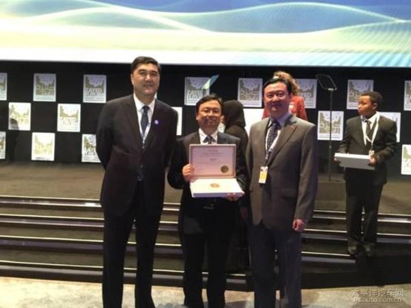 比亚迪董事长王传福从墨西哥总统培尼亚·涅托手中接过获奖证书