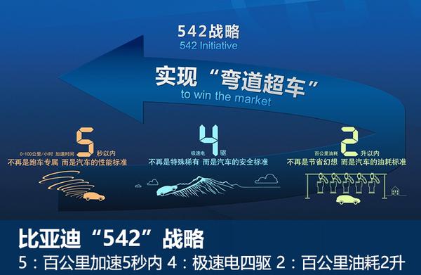 针对新能源汽车,比亚迪于去年发布了“542”战略。简单来说,这是一个技术性指标,“5”代表零至百公里加速5秒以内,“4”代表极速电四驱,“2”代表百公里油耗2升以内。今后,比亚迪旗下的新能源车型都将达到这一标准。