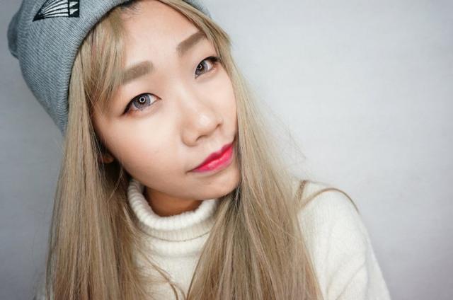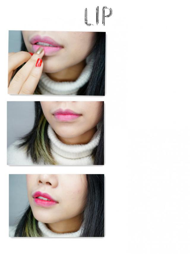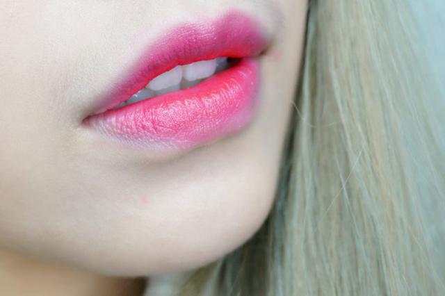 将THE FACE SHOP的粉色染唇液点在中央用手指均匀的向外轻拍晕染,再叠加一次,第二次的晕染范围可以比第一次小一些,最后在唇部中央点涂上红色的唇膏,MV中渐变的唇妆就完成了