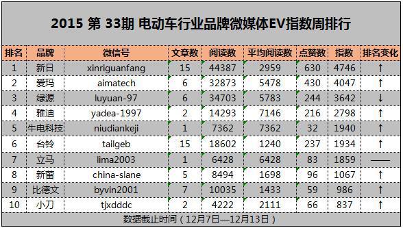 《行业品牌微媒体EV指数周排行榜》是电动车时代网数据研究中心以微信平台为数据来源,面向各电动车品牌在微信平台所发布的文章数量及质量而做出的统计,将于每周三发布上一周数据,敬请关注。